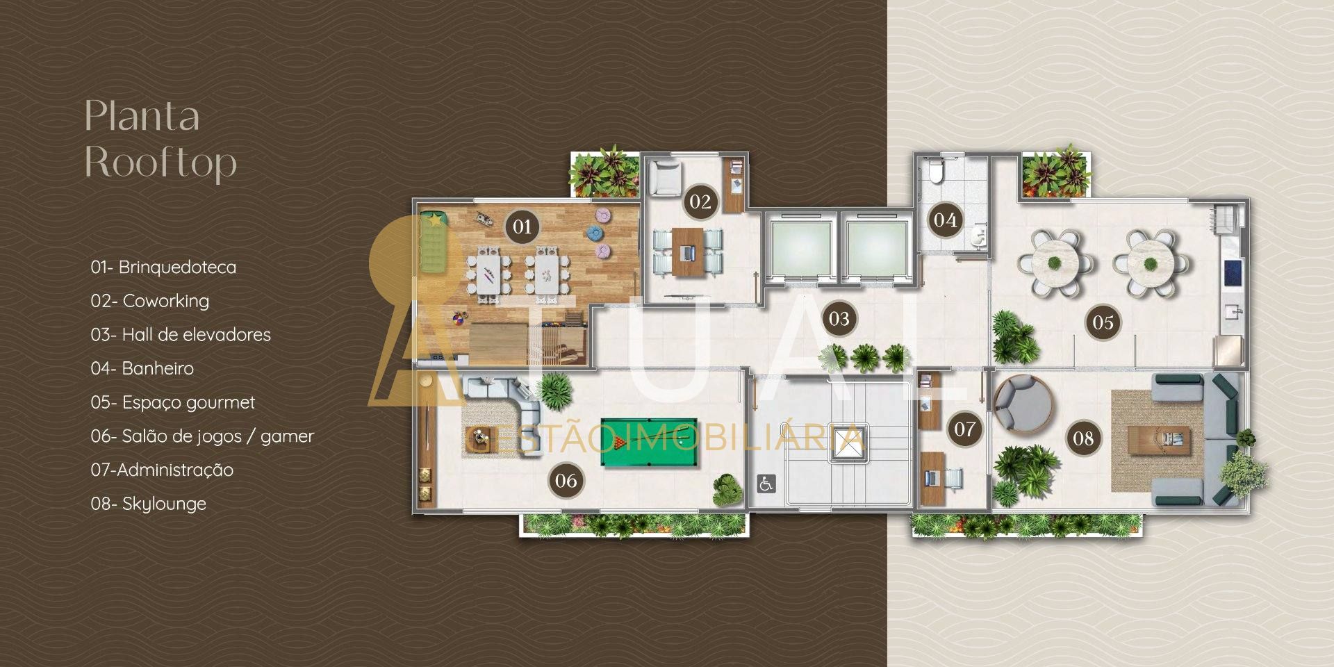 Brinquedoteca, Coworking , Hall de elevadores, Banheiro, Espaço gourmet, Salão de jogos / gamer, Salão de Festas, Bar, Hall de Elevadores Academia ,Deck , Piscina, Deck Molhado , Espaço Gourmet da Piscina ,Banheiro.